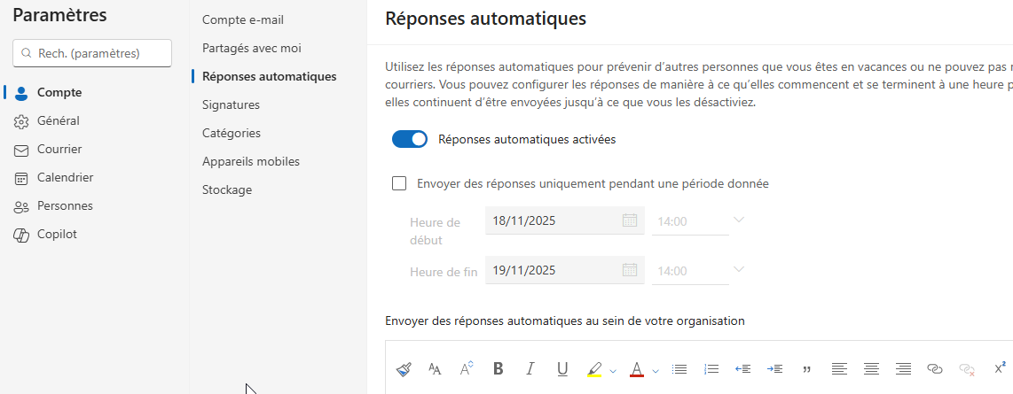 - Sur la partie de gauche, cliquez dans le menu sur Compte / Réponses automatiques