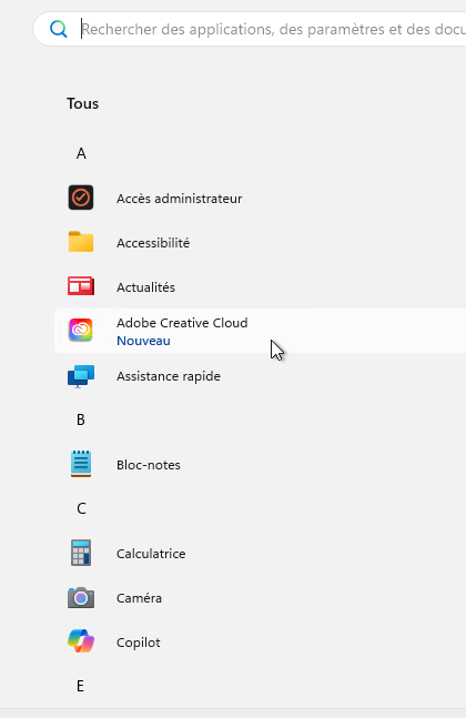 - Ouvrir le logiciel Creative Cloud Desktop depuis le menu démarrer