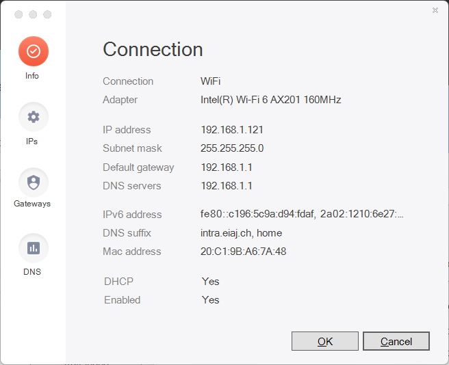 - Le bouton "Advanced" vous permet de voire une version plus complète de votre configuration réseau actuelle :
